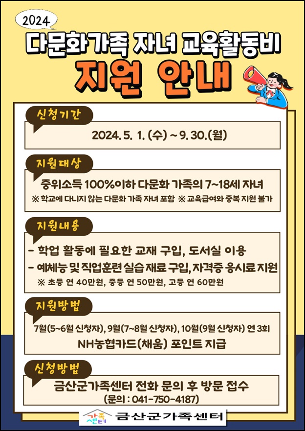 ±Ý»ê±º°¡Á·¼¾ÅÍ, ´Ù¹®È­ÀÚ³à ±³À°È°µ¿ºñ Áö¿ø