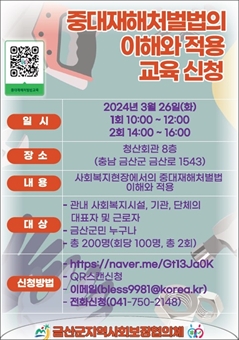±Ý»ê±ºÁö¿ª»çȸº¸ÀåÇùÀÇü´Â ¿À´Â 26ÀÏ ±Ý»êÀ¾ û»êȸ°ü¿¡¼­ Áß´ëÀçÇØ¿¹¹æ ±³À°À» ½Ç½ÃÇÑ´Ù. À̹ø ±³À°Àº ¾ÈÀü°ü¸® Àü¹® °­»ç¸¦ ÃʺùÇØ ¿ÀÀü 10½Ã¿Í ¿ÀÈÄ 2½Ã¿¡ ...
