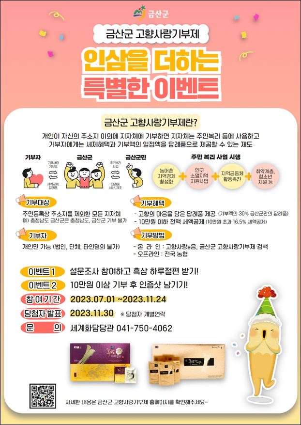 ±Ý»ê±ºÀÌ ¿À´Â 24ÀϱîÁö °íÇâ»ç¶û±âºÎÁ¦ Àü¿ë ´©¸®Áý(https://geumsanlove.kr/)¿¡¼ ¼³¹®Á¶»ç¸¦ Çϰųª ±âºÎ¸¦ ÀÎÁõÇϸé È«»ïÀ» Áִ Ưº°ÇÑ À̺¥Æ®¸¦ ÁøÇàÇÑ´Ù.