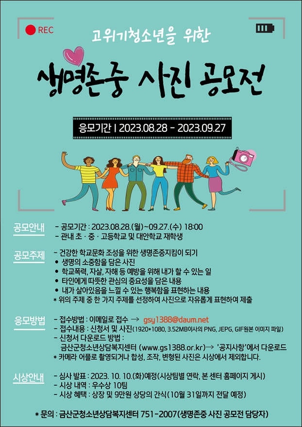 ±Ý»ê±ºÃ»¼Ò³â»ó´ãº¹Áö¼¾ÅÍ(¼¾ÅÍÀå ¹Ú¼±¿ì)´Â 28ÀϺÎÅÍ ¿À´Â 10¿ù 31ÀϱîÁö  °ü³» ÃÊ¡¤Áß¡¤°íµîÇб³ ¹× ´ë¾ÈÇб³¿¡ ÀçÇÐ ÁßÀΠû¼Ò³âÀ» ´ë»óÀ¸·Î Çб³Æø·Â ¿¹¹æÀ» À§ÇÑ ¡®»ý¸íÁ¸Áß »çÁø °ø¸ðÀü¡¯À» ÁøÇàÇÑ´Ù°í ¹àÇû´Ù.