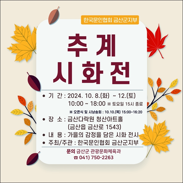 ¸Å³â º½‧°¡À»¿¡ °³ÃֵǴ Çѱ¹¹®ÀÎÇùȸ ±Ý»ê±ºÁöºÎÀÇ ½ÃÈ­ÀüÀº ±Ý»ê Áö¿ªÀÇ °³¼ºÀ» ´ãÀº ÇâÅä»ö £Àº ½ÃÈ­¿Í ½Ã ³¶¼ÛÀ» ¼±º¸¿© ±Ý»ê ±º¹Îµé¿¡°Ô ÀÏ»ó ¼Ó ÈÞ½ÄÀ» ÁÖ´Â ¹®È­¿¹¼ú Çà»ç·Î ÀÚ¸® Àâ¾Ò´Ù.