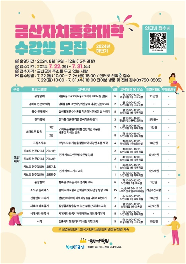 ÀÎÅÍ³Ý ¼±Âø¼ø Âü¿© ½ÅûÀº ¿À´Â 22ÀÏ ¿ÀÀü 10½ÃºÎÅÍ 26ÀÏ ¿ÀÈÄ 6½Ã±îÁö ÁøÇàµÈ´Ù. Á¤¿øÀÌ ¸¶°¨µÇÁö ¾ÊÀº °­Á´ ¿À´Â 29ÀÏ ¿ÀÀü 10½ÃºÎÅÍ 31ÀÏ ¿ÀÈÄ 6½Ã±îÁö ±Ý»ê´Ù¶ô¿ø Æò»ý±³À°ÆÀ¿¡ ¹æ¹® ¹× ÀüÈ­(¢Ï041-750-3505)·Î Á¢¼öÇÏ¸é µÈ´Ù.