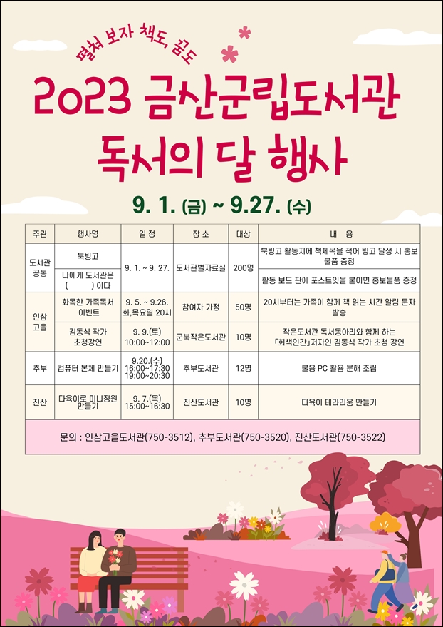 ¶ÇÇÑ µµ¼°üº°·Î °¢°¢ ÃßÁøÇϴ Ưº° Çà»çµµ ´«±æÀ» ²ö´Ù. Àλï°íÀ»µµ¼°ü¿¡¼´Â 9¿ù 5ÀϺÎÅÍ 26ÀϱîÁö ¸ÅÁÖ È, ¸ñ¿äÀÏ ¿ÀÈÄ 8½Ã °¡Á·ÀÌ ÇÔ²² Ã¥ Àд ½Ã°£À» ¾Ë·ÁÁÖ´Â ¡®È¸ñÇÑ °¡Á·µ¶¼¡¯°¡ ÁøÇàµÇ¸ç 9¿ù9ÀÏ ±ººÏÀÛÀºµµ¼°ü¿¡¼´Â ¡®È¸»öÀΰ£¡¯ÀÇ ÀúÀÚ ±èµ¿½Ä ÀÛ°¡ÀÇ ÃÊû °¿¬ÀÌ °³ÃֵȴÙ.