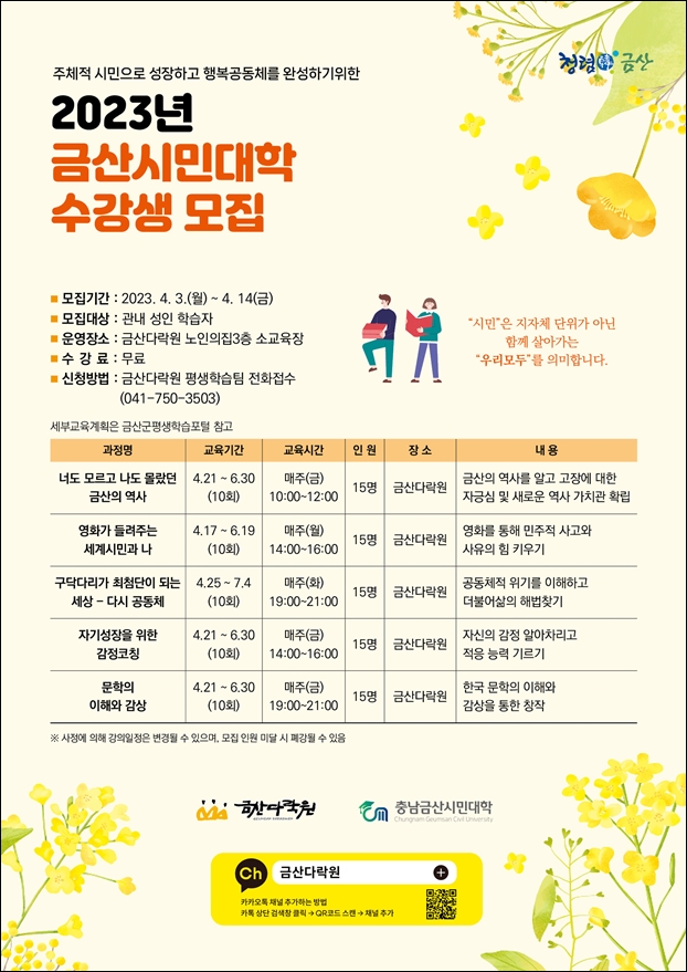 ¸ðÁý ´ë»óÀº °ü³» ¼ºÀÎÀ̸ç, ¿À´Â 14ÀϱîÁö ±Ý»ê´Ù¶ô¿ø(041-750-3503)¿¡ ÀüÈ­·Î ½ÅûÇÏ¸é µÈ´Ù. ¼ö°­·á´Â ¹«·áÀ̸ç, °­ÀÇ ´ç 15¸í¾¿ ÃÑ 75¸íÀ» ¸ðÁýÇÒ °èȹÀÌ´Ù.