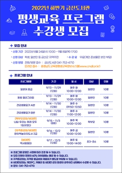 ±Ý»êµµ¼­°ü(°üÀå ¹ÚÂùÈñ)ÀÌ ¿À´Â 9¿ù8ÀϱîÁö ¡®2022³â ÇÏ¹Ý±â Æò»ý±³À° ÇÁ·Î±×·¥¡¯ ¼ö°­»ýÀ» ¼±Âø¼øÀ¸·Î ¸ðÁýÇÑ´Ù.À̹ø ÇÁ·Î±×·¥¿¡¼­´Â ¾î¸°ÀÌ ´ë»óÀ¸·Î ¡ãã¾Æ°¡...