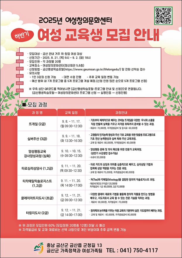 ±Ý»ê±ºÀº Áö¿ª ¿©¼ºµéÀÇ Ãë¾÷ ¿ª·®À» °­È­Çϰí â¾÷ ±âȸ¸¦ È®´ëÇϱâ À§ÇØ '2025³â ÇϹݱâ Ã롤â¾÷ ±³À°' ÇÁ·Î±×·¥À» ¿À´Â 9¿ùºÎÅÍ 11¿ù±îÁö ¿©¼ºÃ¢Àǹ®È­¼¾ÅÍ¿¡¼­ ¿î¿µÇÑ´Ù.