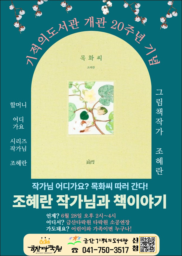 Á¶Çý¶õ ÀÛ°¡´Â ¡®ÇÒ¸Ó´Ï, ¾îµð°¡¿ä?¡¯ ½Ã¸®Áî¿Í ¡®»óÃß¾¾, Âü»õ¡¯ µîÀÇ ÀúÀÚ·Î À̳¯ ÀÚ½ÅÀÇ Àú¼­ÀÎ ¡®¸ñÈ­¾¾¡¯¸¦ ÁÖÁ¦·Î Ư°­À» ÁøÇàÇÑ´Ù. Ư°­¿¡´Â ¾î¸°ÀÌ¿Í °¡Á·ÀÌ ÇÔ²² Âü¿©ÇÏ¸ç ¡®¸ñÈ­¾¾¡¯ÀÇ ÁýÇÊ ¹è°æ°ú °úÁ¤ µîÀ» µè°í ÁúÀÇÀÀ´ä°ú ÇÔ²² µ¶ÈÄȰµ¿ÀÌ À̾îÁø´Ù.