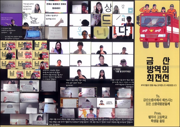 º°¹«¸®Çб³ ÇлýµéÀº ÇöÀç °ü³» Äڷγª19 È®ÁøÀÚ ±ÞÁõÀ¸·Î ´ë¸é¼ö¾÷ÀÌ ¾î·Á¿öÁü¿¡ µû¶ó È­»óȸÀÇ ½Ã½ºÅÛÀ» Ȱ¿ëÇØ ±³À°À» ÁøÇàÇϰí ÀÖÀ¸¸ç, Äڷγª19¸¦ ±Øº¹Çϱâ À§ÇØ ÇöÀå¿¡¼­ Ȱ¾àÇϰí ÀÖ´Â ¼Ò¹æ°üµéÀ» ÀÀ¿øÇÏ°í °¨»çÇÑ ¸¶À½À» ´ãÀº ¸Þ½ÃÁö¸¦ È­¸éÀ» Ȱ¿ëÇØ ÀÀ¿øÆ÷½ºÅÍ·Î ¸¸µé¾ú´Ù.