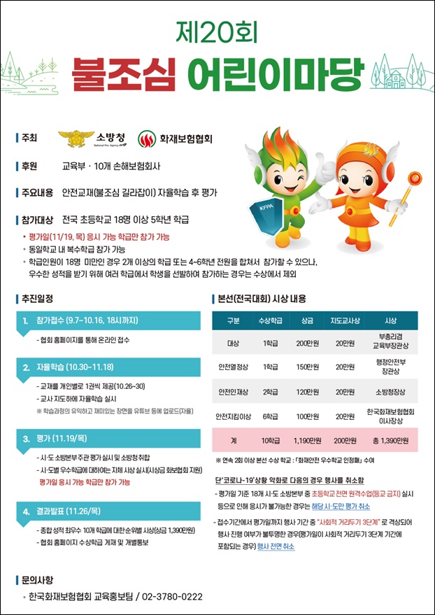 À̹ø ´ëȸ´Â Äڷγª19·Î ÀÎÇØ ±âÁ¸¿¡ »õÇàµÇ´ø ½Ã¡¤µµ Áö¿ª¿¹¼± ¾øÀÌ ¼Ò¹æÃ» ÁÖ°ü Àü±¹´ÜÀ§ º»¼±Æò°¡¸¸ ½Ç½ÃµÇ°í, ´ë»óÀ» ¼ö»óÇÏ´Â 1Çб޿¡´Â 200¸¸¿øÀÇ »ó±Ý°ú ºÎÃѸ®°â ±³À°ºÎÀå°ü»óÀÌ ÁÖ¾îÁö¸ç Âü°¡¸¦ Èñ¸ÁÇÏ´Â ÇбÞÀº Çѱ¹ÈÀ纸ÇèÇùȸ ȨÆäÀÌÁö(www.kfpa.or.kr)¸¦ ÅëÇØ ¿Â¶óÀÎ Á¢¼ö°¡ °¡´ÉÇÏ´Ù.