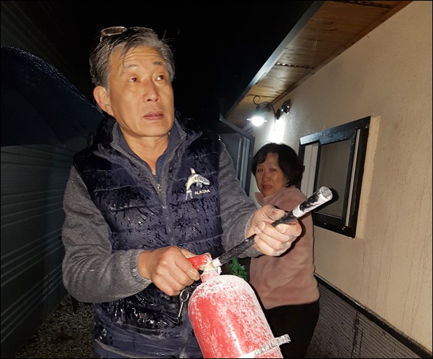 ¼Ò¹æ¼­¿¡ µû¸£¸é °ÅÁÖÀÚ Ãָ𾾰¡ ½Ä»ç¸¦ ¸¶Ä¡°í ¼³°ÅÁö Áß Áý¾È¿¡ ¿¬±â°¡ ³ª¼­ ÁÖº¯À» µÑ·¯º¸´Ï º¸ÀÏ·¯ ¿¬Åë »óºÎÀÇ Ã³¸¶¿¡ È­¿°ÀÌ ÈÛ½ÎÀÎ °ÍÀ» ¹ß°ßÇÏ°í ³²Æí°ú ÁÖº¯ ÀÌ¿ô¿¡°Ô ¾Ë·È°í, À̸¦ ÀÎÁöÇÑ ³²Æí ³ë¸ð¾¾°¡ Áý¾È¿¡ ÀÖ´ø ¼ÒÈ­±â¸¦ ¹æ»çÇÏ°í µÚÀ̾î ÁÖº¯ ÀÌ¿ôµéÀÌ Áý¿¡ ÀÖ´Â Åõô¿ë ¼ÒÈ­±â¿Í ¼ÒÈ­±â¸¦ Ãß°¡·Î »ç¿ëÇØ Ãʱâ ÁøÈ­¿¡ ¼º°øÇß´Ù.