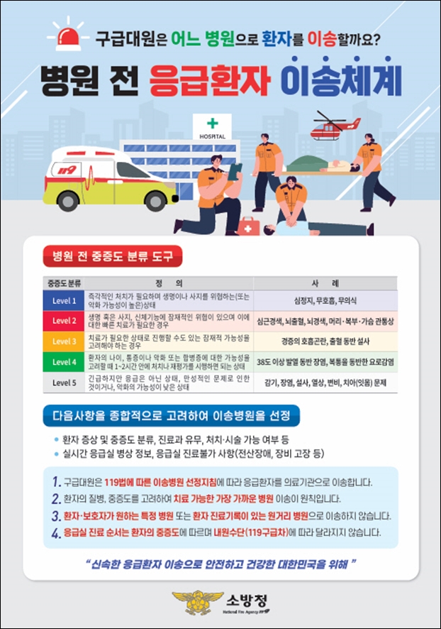 ÀÌ¿¡ ¼Ò¹æÃ»Àº ÁßÁõµµ ºÐ·ù¸¦ ÀÏ¿øÈ­Çϱâ À§ÇØ Çѱ¹Çü ÁßÁõµµ ºÐ·ùü°è(KTAS) ±âÁØÀ¸·Î ÅëÀÏÇØ ÀÌ¼Û ´Ü°èºÎÅÍ È¯ÀÚÀÇ Áõ»ó¿¡ µû¸¥ ÀûÁ¤ º´¿øÀ» ¼±Á¤ÇÏ¿© ½Å¼ÓÇÑ Ä¡·á¸¦ ¹ÞÀ» ¼ö ÀÖµµ·Ï Çß´Ù.