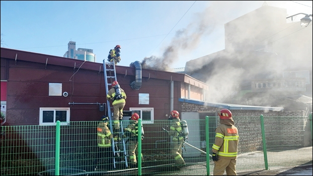 ¡ã±Ý»ê¼Ò¹æ¼­ ¼Ò¹æ´ë¿øµéÀÌ °ü³» À½½ÄÁ¡¿¡¼­ ¹ß»ýÇÑ È­À縦 ÁøÈ­ÇÏ´Â ¸ð½À. ¨Ï±Ý»ê¼Ò¹æ¼­