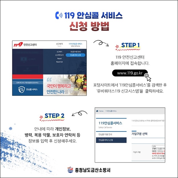 ¡®119¾È½ÉÄÝ ¼­ºñ½º¡¯´Â ÀÀ±Þ»óȲ ¹ß»ý ½Ã 119·Î ½Å°íÇÏ¸é ½Å°í ÀüÈ­¹øÈ£·Î »çÀü ÀÔ·ÂµÈ °³ÀÎÁ¤º¸(º´·Â, º¹¿ë ¾à¹° µî)°¡ Ã⵿ÇÏ´Â ±¸±Þ´ë¿ø¿¡°Ô Àü´ÞµÅ ÀûÀýÇÑ ÇöÀå Á¶Ä¡¿Í º´¿ø À̼ÛÀ» ½Å¼ÓÈ÷ ÀÌ·ïÁú ¼ö ÀÖµµ·Ï µ½´Â´Ù.