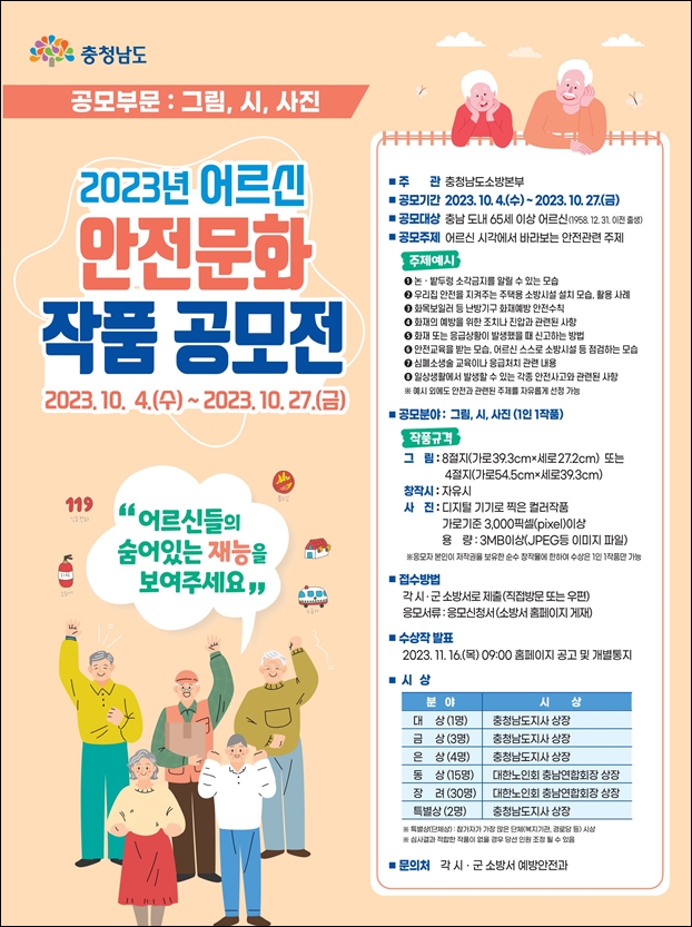 ±Ý»ê¼Ò¹æ¼­(¼­Àå ÁøÁ¾Çö)´Â ¾î¸£½ÅµéÀÇ ¾ÈÀüÀǽÄÀ» Çâ»ó½Ã۱â À§ÇØ ¡®Á¦3ȸ Ãæ³² ¾î¸£½Å ¼Ò¹æ ¾ÈÀü¹®È­ °ø¸ðÀü¡¯ Âü°¡ÀÚ¸¦ ¸ðÁýÇÑ´Ù°í 11ÀÏ ¹àÇû´Ù.