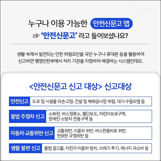 Áö³­ÇØ 6¿ùºÎÅÍ ÇàÁ¤¾ÈÀüºÎ´Â ¡®¾ÈÀü½Å¹®°í¡¯ ¾ÛÀ» ¿î¿µÇØ ¹ø°Å·Î¿î ÀýÂ÷ ¾øÀÌ ÇÚµåÆùÀ¸·Î ½±°í ºü¸£°Ô ¼Ò¹æÂ÷ Àü¿ë ±¸¿ª ³» ºÒ¹ý ÁÖ¡¤Á¤Â÷ Â÷·®À» ½Å°íÇÒ ¼ö ÀÖµµ·Ï Çß´Ù.