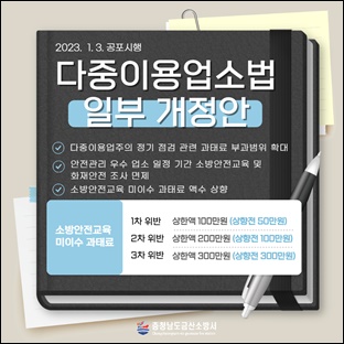 ¶Ç ´ÙÁßÀÌ¿ë¾÷ÁÖÀÇ ¹ý±Ô À§¹Ý ÇàÀ§¿¡ ´ëÇÑ °úÅÂ·á ºÎ°ú ±âÁØÀÌ ¼Ò¹æ¾ÈÀü±³À° ¹ÌÀ̼öÀÇ °æ¿ì 1Â÷ À§¹Ý °úÅ·ᰡ 50¸¸ ¿ø¿¡¼­ 100¸¸ ¿øÀ¸·Î, 2Â÷ À§¹ÝÀº 100¸¸ ¿ø¿¡¼­ 200¸¸ ¿øÀ¸·Î »óÇâµÈ´Ù.