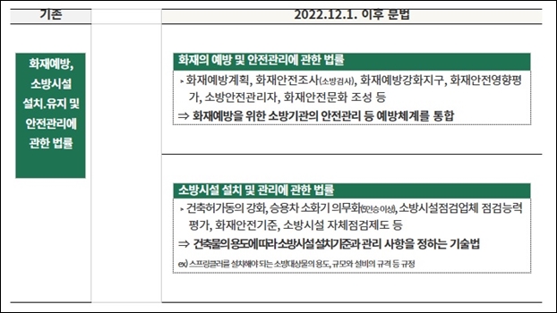 ¼Ò¹æ¼ °ü°èÀÚ´Â ¹ý·ÉÀÌ °³Á¤µÊ¿¡ µû¶ó ¡°±×°£ ¼Ò¹æ½Ã¼³¹ý¿¡ ÈÀç ¿¹¹æ ¾ÈÀü°ü¸® ¹× ¼Ò¹æ½Ã¼³ ¼³Ä¡±âÁØ ±ÔÁ¤ÀÌ È¥ÀçµÇ´Â µî ¹ýü°è°¡ º¹ÀâÇØ ºÐ¹ý Çʿ伺ÀÌ Á¦±âµÅ ¿Ô´ø ¸¸Å, À̹ø ºÐ¹ý ½ÃÇàÀ¸·Î ¡®ÈÀç ¿¹¹æ¡¯°ú ¡®¼Ò¹æ½Ã¼³¡¯ ºÐ¾ß·Î ³ª´¶ ¹ý·ü ³»¿ëÀ» ±¹¹ÎÀÌ ´õ¿í Àͼ÷ÇÏ°í ½±°Ô ÀÌÇØÇÒ ¼ö ÀÖÀ» °ÍÀ¸·Î º¸Àδ١±°í ¼³¸íÇß´Ù.