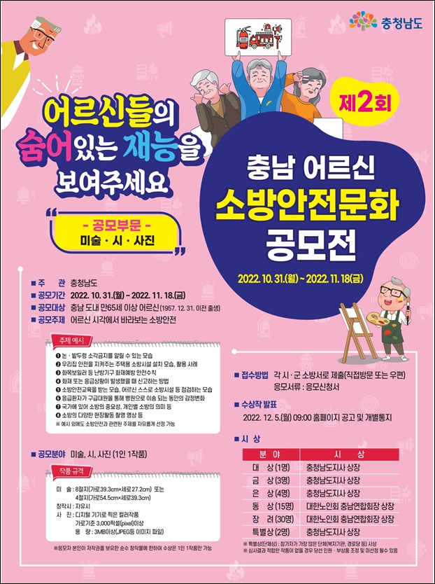 À̹ø °ø¸ðÀüÀº Àç³­¿¡ Ãë¾àÇÑ ¾î¸£½ÅµéÀÇ ¾ÈÀüÀÇ½Ä Á¦°í¸¦ À§ÇØ °³ÃֵǸç, ¾î¸£½Å ½Ã°¢¿¡¼­ º¸´Â ¼Ò¹æ¾ÈÀüÀ» ÁÖÁ¦·Î ¹Ì¼ú¡¤½Ã¡¤»çÁø ¼¼ °¡Áö Áß Èñ¸ÁÇÏ´Â ºÐ¾ß ÀÛǰÀ» ¿À´Â 18ÀϱîÁö Á¦ÃâÇÏ¸é µÈ´Ù.