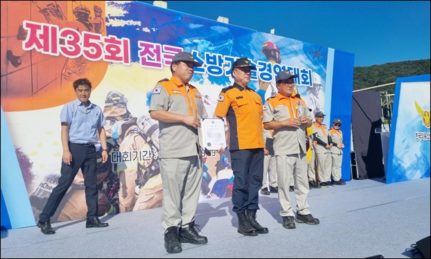¡ãÁö³­ 27ÀÏ ¿­¸° ¡®Á¦35ȸ Àü±¹ÀÇ¿ë¼Ò¹æ´ë ¼Ò¹æ±â¼ú°æ¿¬´ëȸ¡¯¿¡¼­ 3À§¸¦ Â÷ÁöÇÑ Áø»ê¸éÀÇ¿ë¼Ò¹æ´ë ´ë¿øµéÀÇ ½Ã»ó½Ä ¸ð½À. ¨Ï±Ý»ê¼Ò¹æ¼­
