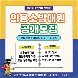 »ó¹Ý±â ½Å±Ô ÀÇ¿ë¼Ò¹æ´ë¿ø °ø°³¸ðÁý ±â°£Àº 2¿ù 27ÀϱîÁöÀÌ´Ù. Áö¿øÇϰíÀÚ ÇÏ´Â »ç¶÷Àº ±Ý»ê¼Ò¹æ¼­ ȨÆäÀÌÁö¿¡ °ø°í¹®À» Âü°íÇØ ÀÔ´ë½Åû¼­, À̷¼­, Áֹεî·Ïµîº», ÀÚ°ÝÁõ »çº» µî Çʿ伭·ù¸¦ 3Ãþ ¼Ò¹æÇàÁ¤°ú ¶Ç´Â °üÇÒ 119¾ÈÀü¼¾ÅÍ¿¡ ¹æ¹® ¶Ç´Â ¿ìÆíÀ¸·Îµµ Á¢¼öÇÏ¸é µÈ´Ù.