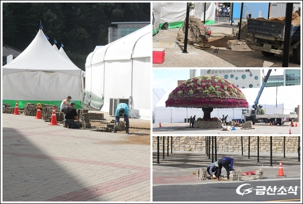 ÀÔ±¸¸¦ Åë°úÇØ Çà»çÀåÀ¸·Î µé¾î°¡ÀÚ ¹Ý´ë ¹æÇâÀÎ ¾àÃʽÃÀå ¹æÇâ ÃâÀÔ±¸ °¡±îÀÌ¿¡¼­ ÀκεéÀÌ º¸µµºí·ÏÀ» ½Ã°øÇÏ´Â ¸ð½ÀÀ» º¼ ÀÖ¾ú´Ù. º¸µµºí·Ï ½Ã°øÀº ¿©·¯ °÷¿¡¼­ µ¿½Ã´Ù¹ßÀûÀ¸·Î ÁøÇàµÇ°í ÀÖ¾ú°í, Çà»çÀå Áß¾Ó ºÎºÐ¿¡ À§Ä¡ÇÑ Áß¾ÓÁ¶Çü¹°À» ²Ù¹Ì±â À§ÇØ ÀκεéÀº Èò»ö º®µ¹À» Á¤½Å¾øÀÌ ½×¾Æ°¡°í ÀÖ¾ú´Ù.