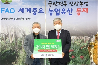 ¡ã Áö³­ 8ÀÏ º£¸®ÆÊÄÚ¸®¾Æ Àü¿µ±â ´ëÇ¥(¿ÞÂÊ)°¡ ¾Æ·Î´Ï¾Æ ºÐ¸»½ºÆ½ 500¹Ú½º¸¦ ±âŹÇÑ ÈÄ ¹®Á¤¿ì ±Ý»ê±º¼ö¿Í ±â³ä»çÁøÀ» ÃÔ¿µÇÏ´Â ¸ð½À. ¨Ï±Ý»ê±ºÃ»±Ý»ê±º Á¦¿ø¸é...