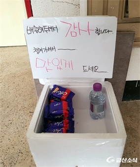 ¼ö°³¿ù ÀüºÎÅÍ ±Ý»êÀ¾ »ïÀÏ¾ÆÆÄÆ®ÀÇ ÇÑ Áý Çö°ü¹® ¾Õ¿¡ ¹è´ÞÇÏ´Â »ç¶÷µéÀÇ ³ë°í¸¦ À§ÇØ ÃÊÄÚ·¿, ½Ã¿øÇÑ ¹°, ¿¡À̽º ºñ½ºÄÏÀ» ³õ¾Æ ÈÆÈÆÇÑ Á¤À» ´À³¢°Ô Çϰí ÀÖ´Ù...