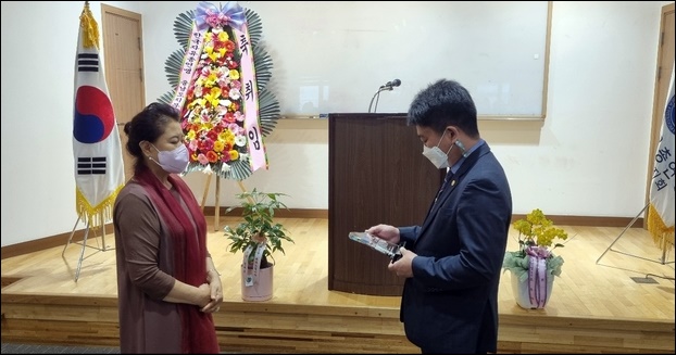 ¡ãÁö³­´Þ 29ÀÏ Çѱ¹ÀÚÀ¯ÃÑ¿¬¸Í ±Ý»ê±ºÁöȸ Á¦5´ë ¿©¼ºÈ¸ÀåÀ¸·Î ÃëÀÓÇÑ ¿À¿À³² ȸÀå(»çÁø ¿ÞÂÊ)ÀÌ ±è±â¿µ ÁöȸÀå¿¡°Ô ÀÓ¸íÀåÀ» ¹ÞÀº ÈÄ ±â³ä»çÁøÀ» ÃÔ¿µÇÏ´Â ¸ð½À. ¨ÏÇѱ¹ÀÚÀ¯ÃÑ¿¬¸Í ±Ý»ê±ºÁöȸ