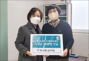 ÇϳªÀºÇà ±Ý»êÁöÁ¡ ±èÀº¼÷ ÁöÁ¡Àå(¿ÞÂÊ)Àº Áö³­ 15ÀÏ ¿ÀÈÄ2½Ã ¿¬¸»À» ¸Â¾Æ »ç¶ûȣũ¸¶ Áö¿ª¾Æµ¿¼¾ÅÍ È²°æ¼÷ ¼¾ÅÍÀå¿¡°Ô 100¸¸ ¿øÀÇ ±âºÎ ±ÝÀ» Àü´ÞÇß´Ù.