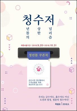 ¡®Ã»¼öÀú(û³â¸ôÀÇ ¼ö»óÇÑ Àú³Î¸®Áò)¡¯¶õ À̸§À¸·Î Á¦ÀÛµÈ ÄíÆùºÏÀº û³â»óÀεéÀÌ ÁÖüÀûÀ¸·Î ¸Å´Þ ¹ßÇàÇÏ´Â ¼Ò½ÄÁö·Î 10¿ùÈ£¿¡´Â 1ÀÏ ±âÁØÀ¸·Î ±Ý»ê½ÃÀå¿¡ ¿ÀÇÂÇÑ 20°³ û³â¸ô Á¡Æ÷¿¡¼ ÀÌ¿ëÇÒ ¼ö ÀÖ´Â ÇÒÀÎÄíÆùÀÌ ´ã°Ü ÀÖ´Ù.