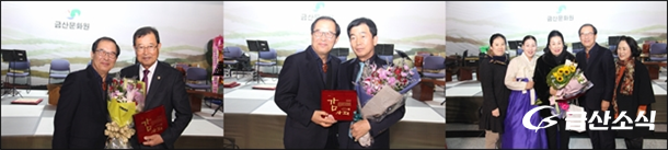 À̾îÁø ±â³ä½Ä¿¡¼­´Â ÀüÀÓ ÀÌöÁÖ ±Ý»ê¹®È­¿øÀåÀÌ ±Ý»ê¹®È­¿ø ȸ¿øµéÀ» ´ëÇ¥ÇØ¼­ Ãæ³²µµÀÇȸ ±èº¹¸¸ ÀÇ¿ø(»çÁø ¿ÞÂÊ)°ú ±è¼®°ï ÀÇ¿ø(»çÁø °¡¿îµ¥), ¸íâ °íÇâÀÓ ¼±»ý(»çÁø ¿À¸¥ÂÊ)¿¡°Ô ±Ý»ê¹®È­¿¹¼ú¹ßÀü¿¡ ±â¿©ÇÑ °ø·Î¿¡ ´ëÇÑ °¨»çÀÇ ¸¶À½À» ´ãÀº °¨»çÆÐ Àü´Þ½Ä°ú, ±â³ä»ç, Ãà»ç µîÀÌ ÁøÇàµÆ´Ù.