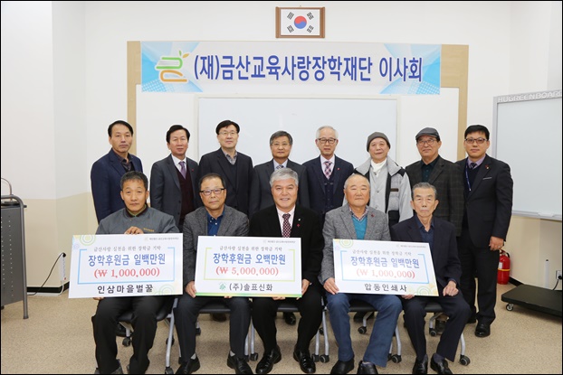 Áö³­ 3ÀÏ ±Ý»ê±³À°»ç¶ûÀåÇÐÀç´Ü¿¡ ¹®Á¤¿ì ±º¼ö¿Í Á¶½Å¿µ ÀÌ»çÀå, ÀåÇÐÀç´Ü ÀÌ»çµé Àü¿øÀÌ Âü¼®ÇÑ °¡¿îµ¥ ¢ß¼ÖÇ¥½ÅÈ­(´ëÇ¥ À庴ȣ) 500¸¸¿ø, ±Ý»êÇÕµ¿Àμâ»ç(´ëÇ¥ À̱¤¿ì) 100¸¸¿ø, Àλ︶À» ¹ú²Ü(´ëÇ¥ Á¤±Ô¹®)¿¡¼­ 100¸¸¿øÀ» °¢°¢ ÀåÇбâ±ÝÀ¸·Î ±âŹÇß´Ù.