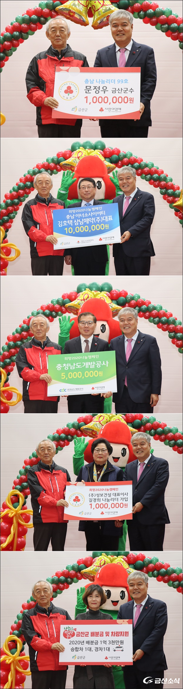 ƯÈ÷ ¼º±Ý±âŹ¿¡¼´Â ¡ãÁö³ÇØ ³ª´®¸®´õ¿¡ °¡ÀÔÇÑ ¹®Á¤¿ì ±º¼ö 100¸¸ ¿ø ¡ã±Ý»ê±º ¾Æ³Ê¼Ò»çÀÌ¾îÆ¼ 1È£ »ï³²Á¦¾à ±èÈ£Åà ´ëÇ¥ 1000¸¸ ¿ø, ¡ãÃæ³²°³¹ß°ø»ç 500¸¸ ¿ø, ¡ã±Ý»ê±º Ãæ³² ³ª´®¸®´õ 226È£ ¼ºº¸°Ç¼³ ±æ°æÈñ ´ëÇ¥°¡ 100¸¸ ¿øÀÇ ¼º±ÝÀ» ÄèôÇßÀ¸¸ç, ³²³à³ë¼Ò ±¸ºÐ ¾øÀÌ ¸ð±Ý ÇöÀåÀ» ã¾Æ ¿ÂÁ¤À» ³ª´³´Ù.