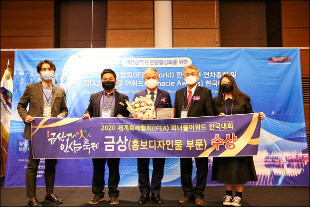 ¡ã¹®Á¤¿ì ±Ý»ê±º¼ö(¿ÞÂÊ)¿Í ¼¼°èÃàÁ¦Çùȸ Çѱ¹ÁöºÎ Á¤°È¯ ȸÀå(¿À¸¥ÂÊ)ÀÌ ¡®ÇdzªÅ¬ ¾î¿öµå Çѱ¹´ëȸ¡¯ µðÀÚÀι° ºÎ¹® ±Ý»ó ¼ö»ó ±â³ä»çÁøÀ» ÃÔ¿µÇÏ´Â ¸ð½À. ¨Ï±Ý»ê±ºÃ»