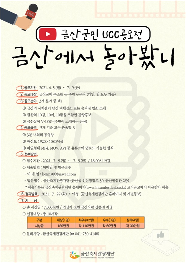 ±Ý»ê±ºÀº ¿À´Â 7¿ù9ÀϱîÁö ¡®±Ý»ê±º¹Î¡¡UCC°ø¸ðÀü¡¯À» °³ÃÖÇÑ´Ù°í 6ÀÏ ¹àÇû´Ù.