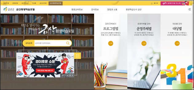 2019³â ±¸ÃàµÈ ±Ý»êÆò»ýÇнÀÆ÷ÅÐÀº ¡ã±Ý»ê±º Àüü Æò»ý±³À° Á¤º¸ ¡ã°­»ç Á¤º¸ ¡ãÆò»ý±³À° ¼Ò½Ä ¡ãÆò»ýÇнÀ½Ã¼³ ¹× µ¿¾Æ¸® ÇöȲ µî¿¡ ´ëÇÑ Á¤º¸¸¦ ´ã°í ÀÖÀ¸¸ç, ±¹°¡ ¹× ¹Î°£¿¡¼­ ÃßÁøÇÏ´Â ´Ù¾çÇÑ ¹«·á ¿Â¶óÀÎ ±³À° »çÀÌÆ®¿Í ¿¬°èÇØ ¿î¿µ ÁßÀÌ´Ù.