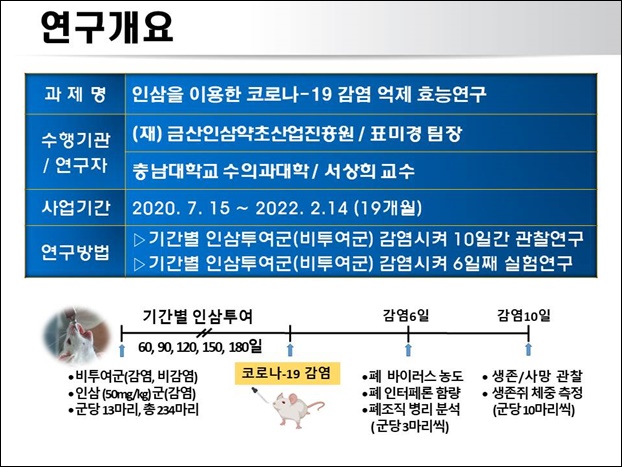 ÁøÈï¿øÀº »ýÁã¿¡ ÀλïÃßÃâ¹°À» ÇÏ·ç¿¡ kg´ç 50mgÀ» 30ÀÏ, 60ÀÏ, 90ÀÏ, 120ÀÏ, 150ÀÏ, 180ÀÏ µ¿¾È ¸ÔÀÎ ´ÙÀ½, Äڷγª-19 ¹ÙÀÌ·¯½º¸¦ ÄÚ·Î °¨¿°½Ã۰í 10ÀÏ µ¿¾È üÁߺ¯È¿Í »ç¸Á·üÀ» °üÂûÇÑ °á°ú, ÀλïÀ» 60ÀÏ µ¿¾È ¸ÔÀÎ Áã´Â ÀλïÀ» ¸ÔÀÌÁö ¾ÊÀº Áã¿¡ ºñÇØ »ç¸Á·üÀÌ 20% °¨¼ÒÇß°í, 90ÀϺÎÅÍ 180ÀϱîÁö ¸ÔÀÎ Áã´Â 30% °¨¼ÒÇØ °í·ÁÀλïÀÌ Äڷγª-19 ¹ÙÀÌ·¯½º °¨¿°¿¡ ÀÇÇÑ »ç¸Á·üÀ» È®½ÇÈ÷ ³·Ãß´Â °ÍÀ» È®ÀÎÇß´Ù°í ¹àÇû´Ù.
