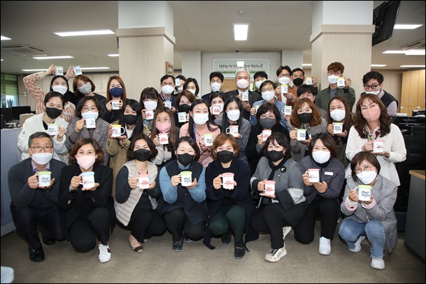 À̳¯ ¹®Á¤¿ì ±Ý»ê±º¼ö¸¦ ºñ·ÔÇÑ Áֹκ¹ÁöÁö¿ø°ú Á÷¿øµéÀÌ Âü¿©ÇØ Ã»·Å ¸Ó±×ÄÅÀ» ³ª´©°í ¡®³ªºÎÅÍ Ã»·ÅÇÏ°Ô ¸ðµÎ°¡ ÇູÇϰԡ¯¶ó´Â Ç¥¾î¸¦ ´ãÀº ¾×ÀÚ¸¦ »ç¹«½Ç¿¡ °É¾ú´Ù.
