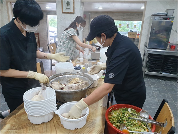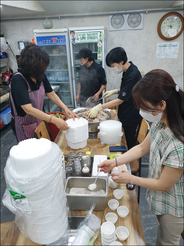 À̳¯ ´ë¿ø 10¿©¸íÀº ¹Ì¸® »ï°èÅÁ°ú ¹ÝÂù µî À½½ÄÀ» ¸¶·ÃÇÑ ÈÄ ´ë»ó °¡±¸¸¦ Á÷Á¢ ã¾Æ ¾ÈºÎ¸¦ »ìÇǰí Ãʺ¹¸ÂÀÌ »ï°èÅÁÀ» Àü´ÞÇßÀ¸¸ç, Äڷγª19 È®»êÀ» ¹æÁöÇϱâ À§ÇØ ¸¶½ºÅ© Âø¿ë µî ¹æ¿ªÁ¶Ä¡¸¦ ÁؼöÇϸ鼭 Çà»ç¸¦ ÁøÇàÇß´Ù.
