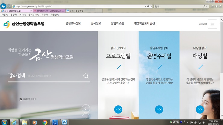 »çÀÌÆ® ÁÖ¼Ò´Â www.geumsan.go.kr/lifelongedu ·Î ¿äÁò À¯ÇàÇÏ´Â Á÷°üÀû Á¤º¸Á¦°øÀÇ ¹ÝÀÀÇü À¥ ¹æ½ÄÀ¸·Î ±¸ÇöÇß´Ù.