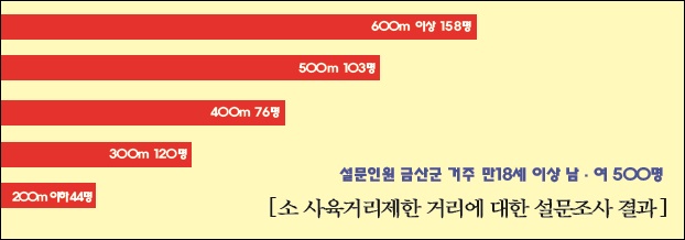 µÅÁöÀÇ °æ¿ì ÇöÇà 1100m ÀÌÇÏ´Â 66¸íÀ¸·Î 13.2%, 1200m 94¸í(18 .8 %), 1300m 87¸í(17.4%), 1400m 16¸í(3.2%), 1500m 237¸í(47.4%)À¸·Î ³ªÅ¸³µÀ¸¸ç, ¸», »ç½¿, ¾ç, Á¥¼Ò, °³,´ß, ¿À¸®, ¸ÞÃ߸®µµ Àü¹ÝÀûÀ¸·Î °Å¸®°È¸¦ ÇØ¾ß ÇÑ´Ù´Â ´äº¯ÀÌ ÁÖ¸¦ ÀÌ·ç¾ú´Ù.