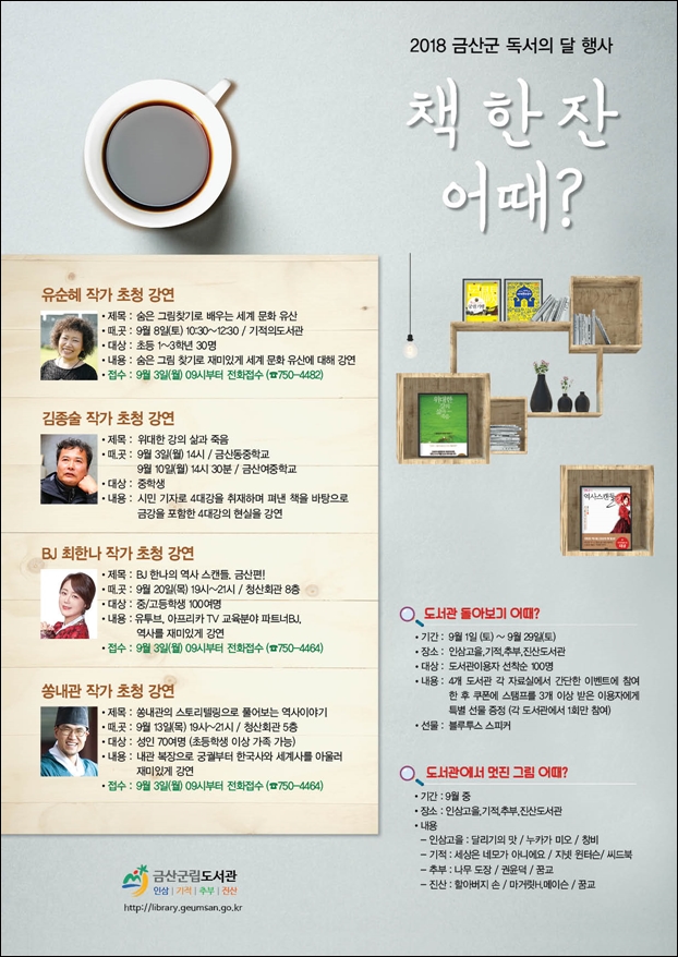 ¿À´Â 9¿ù 8ÀÏ 10½Ã3 0ºÐ¿¡´Â À¯¼øÇý ÀÛ°¡¸¦ ÃÊÃ»ÇØ Ãʵî ÀúÇг⠴ë»óÀ¸·Î ±âÀûÀǵµ¼­°ü¿¡¼­ ¡®¼ûÀº ±×¸² ã±â·Î ¹è¿ì´Â ¼¼°è ¹®È­ À¯»ê¡¯À̶ó´Â ÁÖÁ¦·Î °­¿¬À» ÁøÇàÇϰí, 3Àϰú 10ÀÏ¿¡´Â ±èÁ¾¼ú ÀÛ°¡°¡ ±Ý»êµ¿ÁßÇб³¿Í ±Ý»ê¿©ÀÚÁõÇб³¿¡¼­ ¡®À§´ëÇÑ °­ÀÇ »î°ú Á×À½¡¯À̶ó´Â ÁÖÁ¦·Î °­¿¬À» ÆîÄ£´Ù.