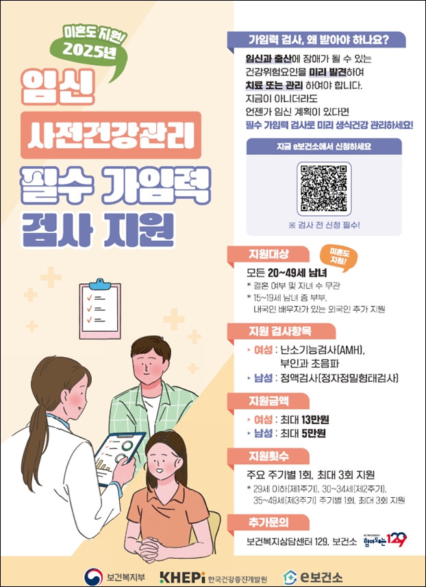 Áö¿ø °Ë»ç Ç׸ñÀ¸·Î´Â ¿©¼ºÀÇ °æ¿ì ³¼Ò±â´É°Ë»ç(AMH), ºÎÀΰú ÃÊÀ½ÆÄ °Ë»çºñ¸¦ ÃÖ´ë 13¸¸ ¿ø±îÁö Áö¿øÇÏ¸ç ³²¼ºÀº Á¤¾×°Ë»ç(Á¤ÀÚÁ¤¹ÐÇüÅÂ) ºñ¿ëÀ» ÃÖ´ë 5¸¸ ¿ø±îÁö Áö¿øÇÑ´Ù.