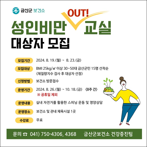 À̹ø ÇÁ·Î±×·¥Àº üÁú·®Áö¼ö(BMI)°¡ 25À̰ųª º¹ºÎºñ¸¸(Ç㸮µÑ·¹ ³²ÀÚ 90cm, ¿©ÀÚ 85cm ÀÌ»ó)ÀÎ ±º¹ÎÀ» ´ë»óÀ¸·Î ÃßÁøµÇ¸ç, ¿À´Â 26ÀϺÎÅÍ 8ÁÖ°£ ÁÖ 3ȸ °úÁ¤À¸·Î º¸°Ç¼Ò ¹× °ü³» üÀ°½Ã¼³¿¡¼ ÁøÇàµÉ ¿¹Á¤ÀÌ´Ù.