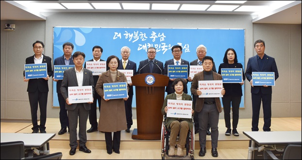 ´õºÒ¾î¹ÎÁÖ´ç ÃæÃ»³²µµÀÇȸ(ÀÇ¿ø´ëÇ¥ ±è¸í¼±) ¼Ò¼ÓÀÇ¿øµéÀÌ 28ÀÏ Ãæ³²µµÃ» ºê¸®Çη뿡¼ ±âÀÚȸ°ßÀ» °®°í ¡®¹Ì±¹ÀÇ ¹æÀ§ºñ ºÐ´ã±Ý 50¾ï ´Þ·¯ ¿ä±¸ öȸ¡±¸¦ °·ÂÈ÷ Ã˱¸ÇÏ°í ³ª¼¹´Ù.