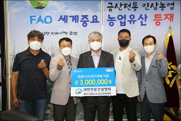 ´ëÇÑÀü¹®°Ç¼³Çùȸ ¼¼Á¾½Ã ÃæÃ»³²µµÈ¸ ±Ý»ê±º¿î¿µÀ§¿øÈ¸(ȸÀå ±èµµ¿¬)°¡ Áö³­ 2ÀÏ ±Ý»ê±º¿¡ Äڷγª19 À§±â±Øº¹ Áö¿ø ¼º±Ý 300¸¸ ¿øÀ» ±âŹÇß´Ù.