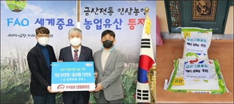¡ãÇѱ¹³ó¾÷Àΰ濵ÀÎ ±Ý»ê±º¿¬ÇÕȸ ÁÖÀçÇö ȸÀå(¿ÞÂÊ µÎ ¹øÂ°)ÀÌ ¼º±ÝÀ» Àü´ÞÇÏ°í ¹®Á¤¿ì ±Ý»ê±º¼ö(¿ÞÂÊ ¼¼ ¹øÂ°)¿Í ±â³ä»çÁøÀ» Âï°í ÀÖ´Ù. ±Ý»ê±ºÀº Çѱ¹³ó¾÷°æ¿µÀÎ...