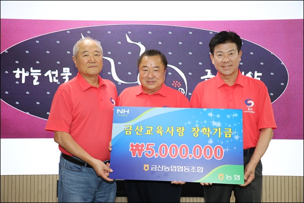 ±Ý»ê±ºÀº ±Ý»ê³ó¾÷Çùµ¿Á¶ÇÕ(Á¶ÇÕÀå °ûº´ÀÏ, »çÁø °¡¿îµ¥)ÀÌ 27ÀÏ ±Ý»ê±ºÃ»¿¡¼­ ¹Ú¹üÀÎ ±º¼ö¿Í Á¶½Å¿µ ÀÌ»çÀåÀÌ Âü¼®ÇÑ °¡¿îµ¥ (Àç)±Ý»ê±³À°»ç¶ûÀåÇÐÀç´Ü¿¡ ÀåÇбâ±Ý 500¸¸ ¿øÀ» ±âŹÇß´Ù°í ¹àÇû´Ù.
