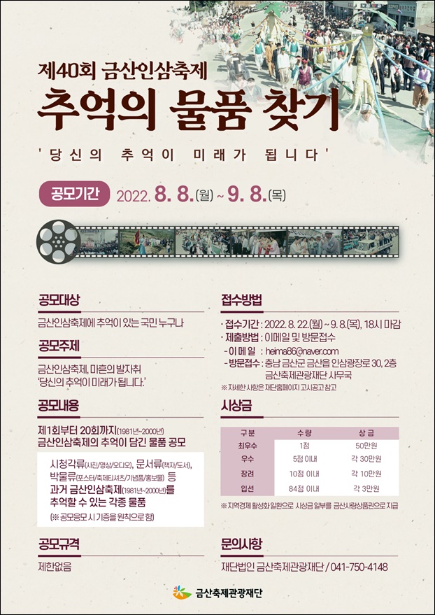 ±Ý»êÃàÁ¦°ü±¤Àç´ÜÀº Á¦40ȸ ±Ý»êÀλïÃàÁ¦¸¦ ¸Â¾Æ ÃàÁ¦ÀÇ Ãß¾ïÀ» µÇµ¹¾Æº¸´Â ½Ã°£À» °®±â À§ÇØ Àü ±¹¹ÎÀ» ´ë»óÀ¸·Î Ãß¾ïÀÇ ¹°Ç° ã±â °ø¸ðÀüÀ» °³ÃÖÇÑ´Ù.