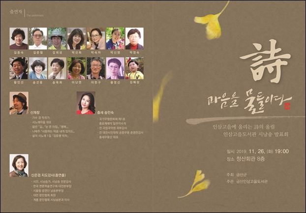 ±Ý»ê±ºÀÌ ÁÖÃÖÇÏ°í ±Ý»êÀλï°íÀ» µµ¼­°üÀÌ ÁÖ°üÇÏ´Â À̹ø Çà»ç´Â ½ÅÀº°â °­»çÀÇ ÃÑ¿¬Ãâ·Î ±æÁ¾¼÷¾¾ µî 14¸íÀÌ ±í¾î°¡´Â °¡À», °¨¼ºÀ» ½Ç¾î ½Ã¸¦ ³¶¼ÛÇϸç ÇÑ ÇØ µ¿¾È ¹è¿ì°í ÀÍÈù °ÍµéÀ» Á¤¸®ÇØ ¹ßÇ¥Çϴ  ½Ã°£ÀÌ´Ù.